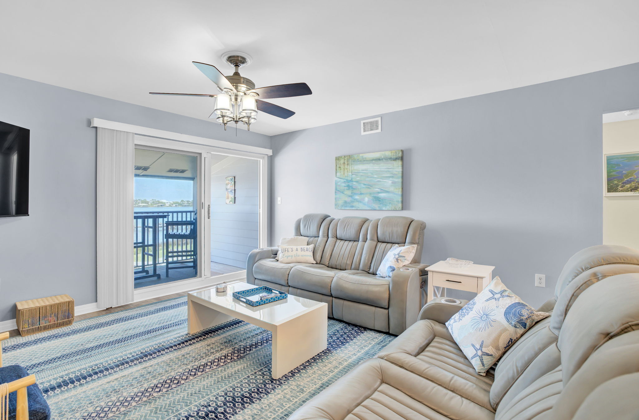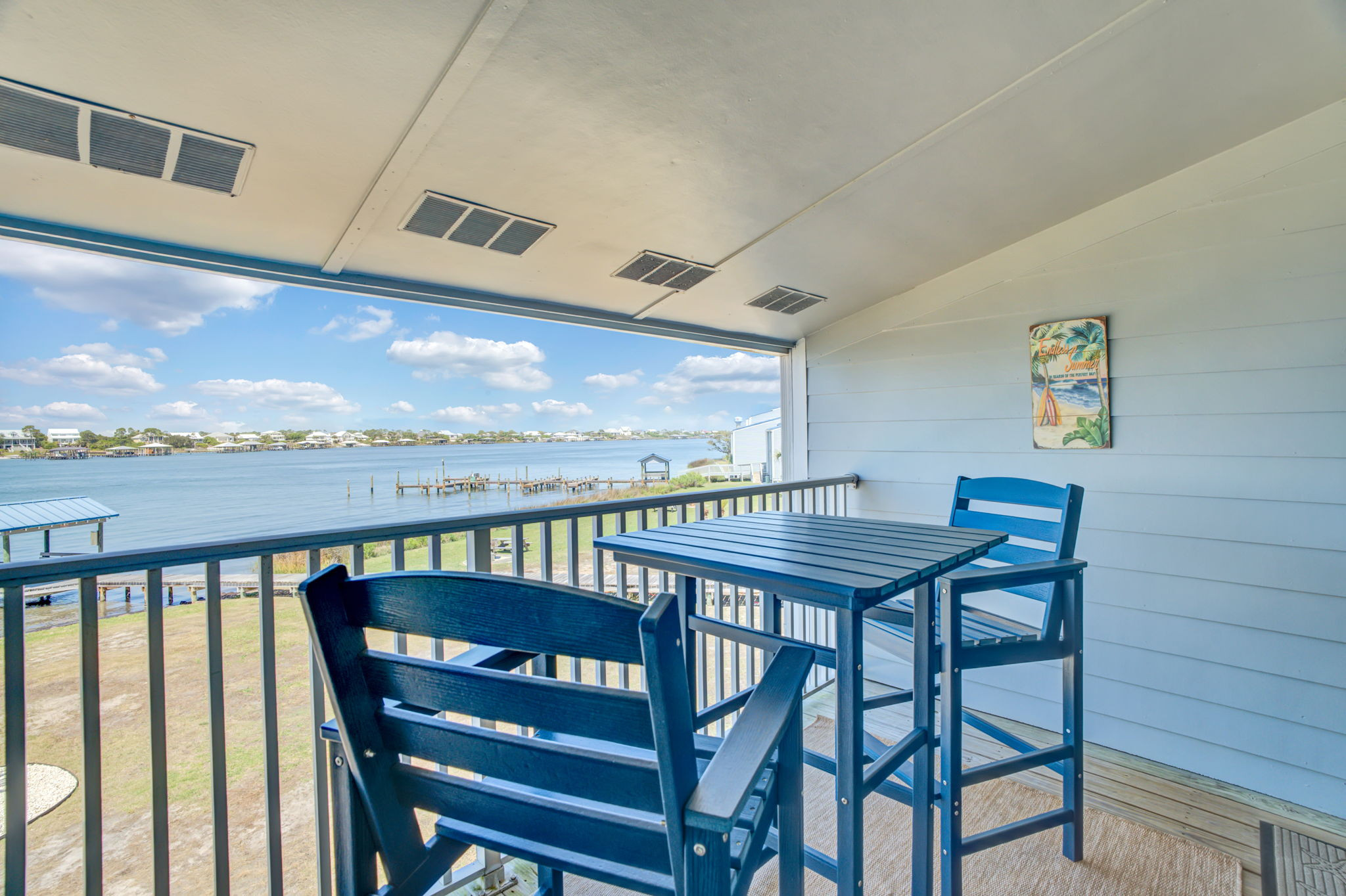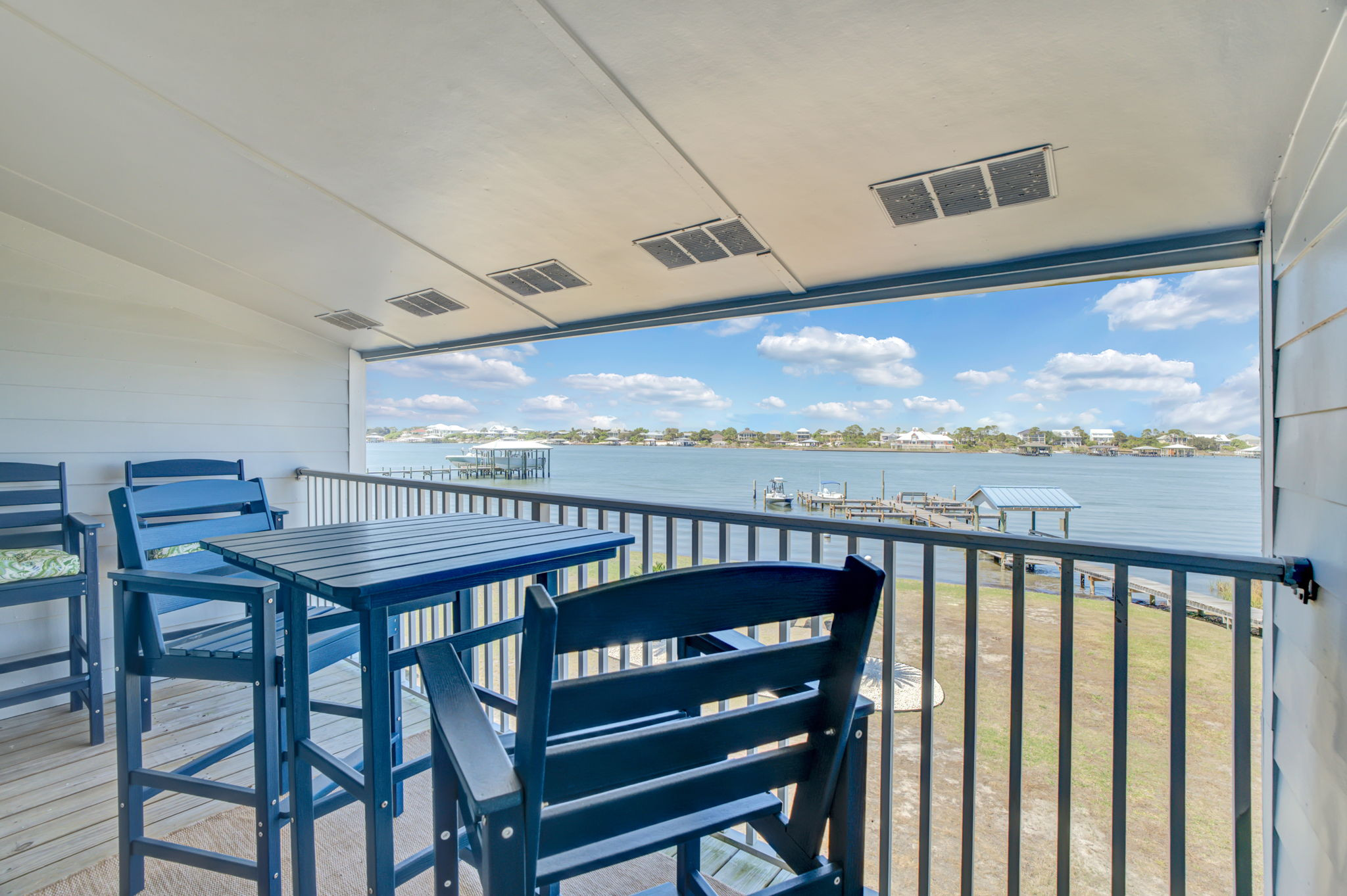 This 2-bedroom, 2-bathroom second-floor condo offers comfort, convenience, and scenic views of Ole River. Relax in the living room with a queen sleeper sofa, cable TV, and balcony access overlooking the water and boat docks.