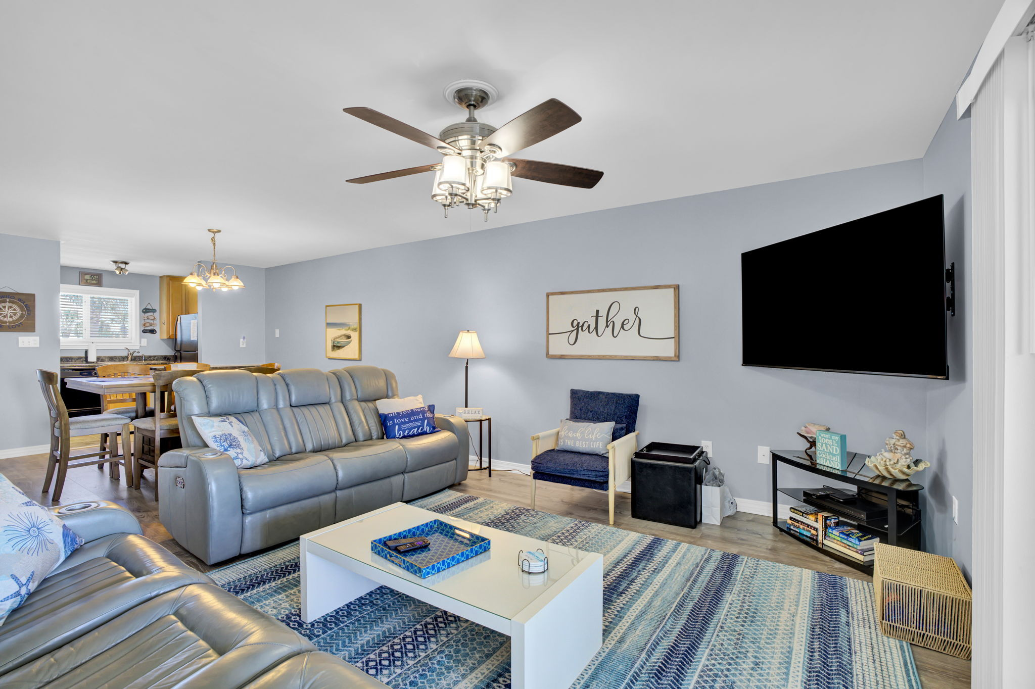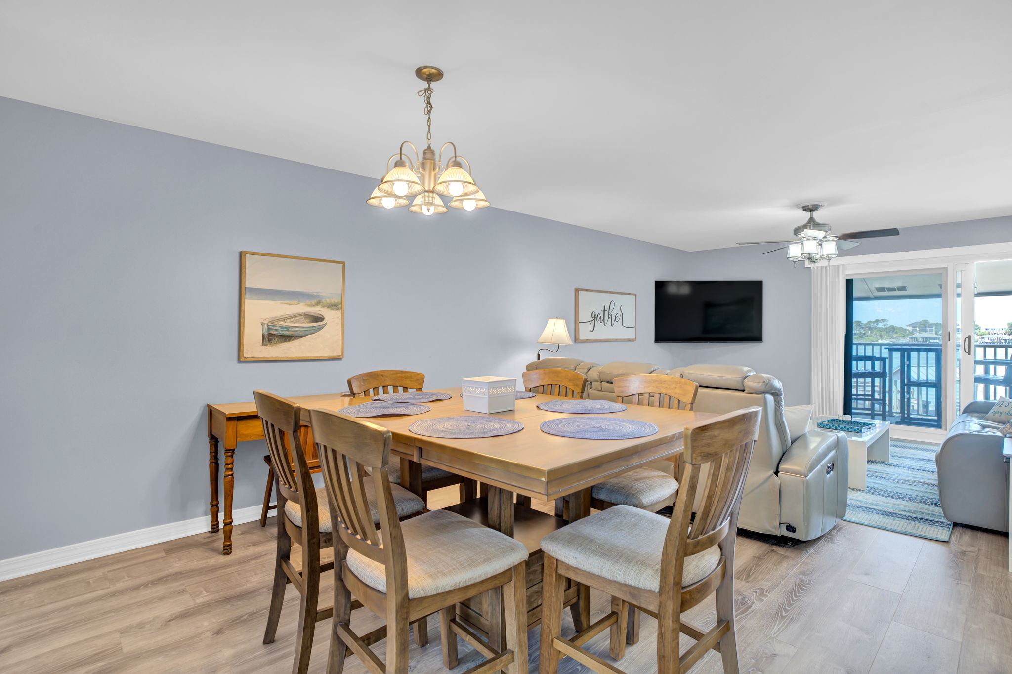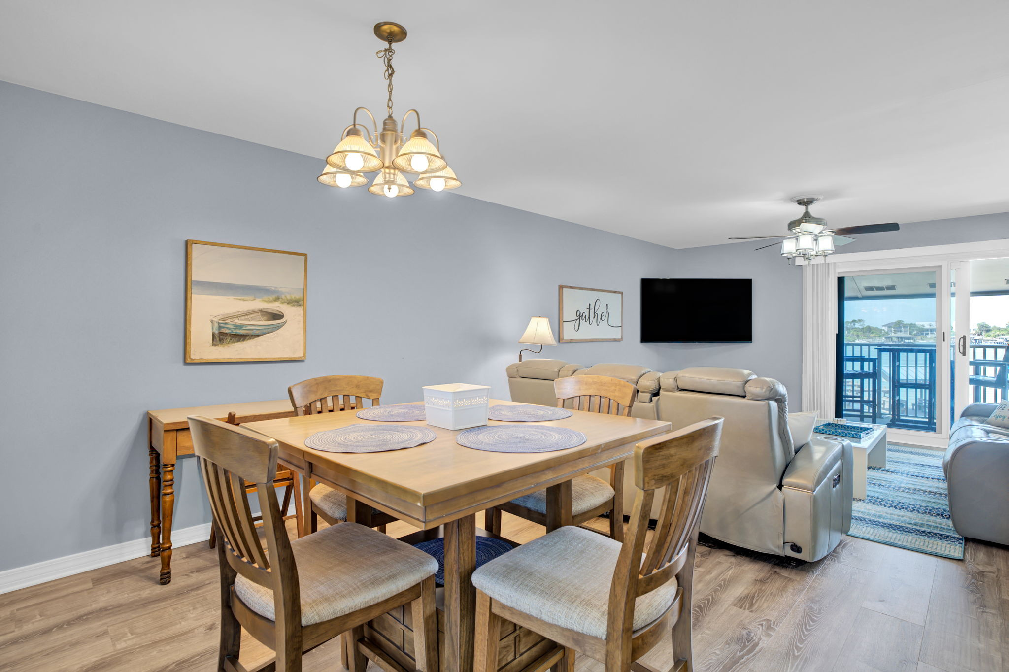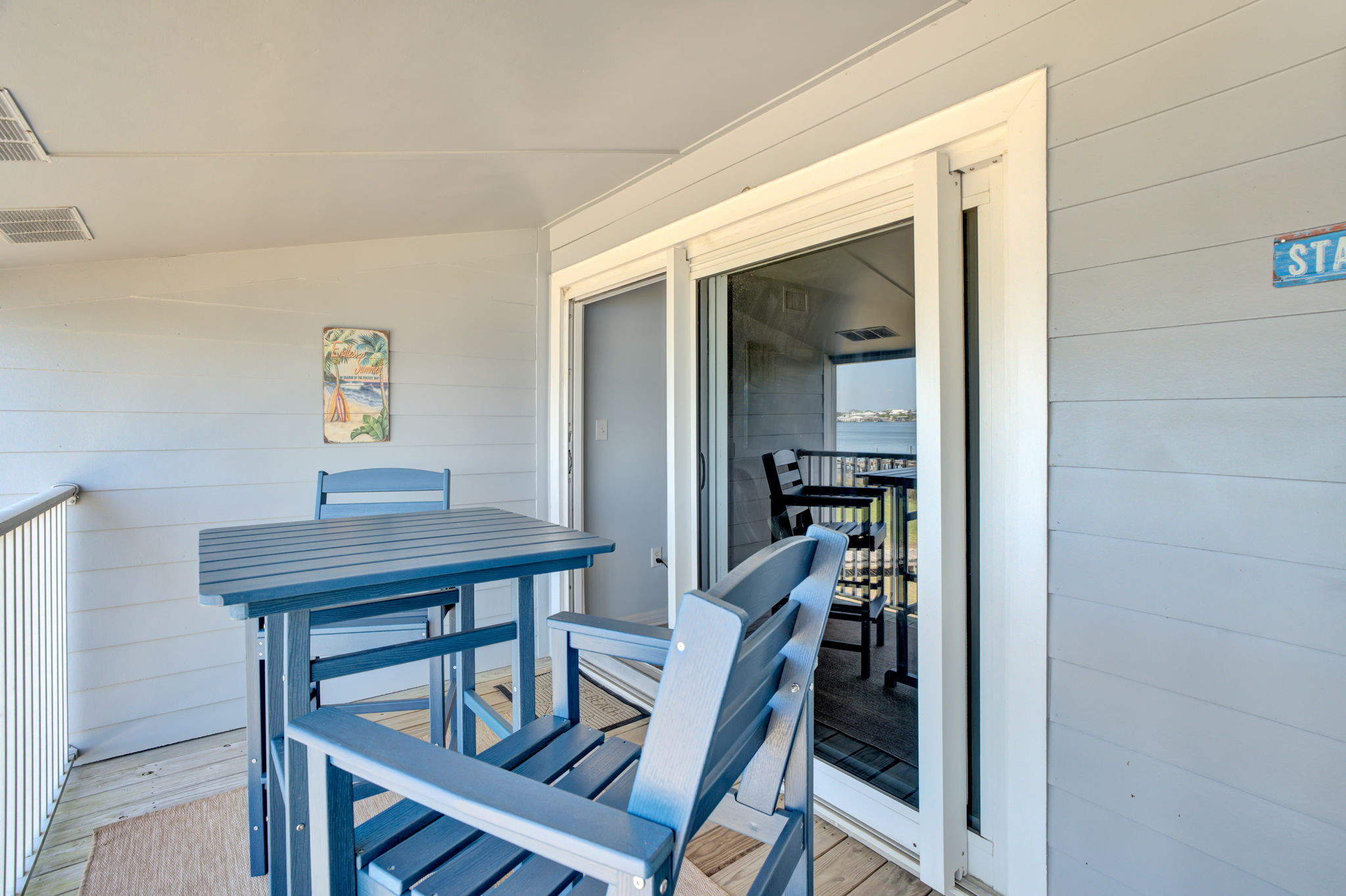 This 2-bedroom, 2-bathroom second-floor condo offers comfort, convenience, and scenic views of Ole River. Relax in the living room with a queen sleeper sofa, cable TV, and balcony access overlooking the water and boat docks.